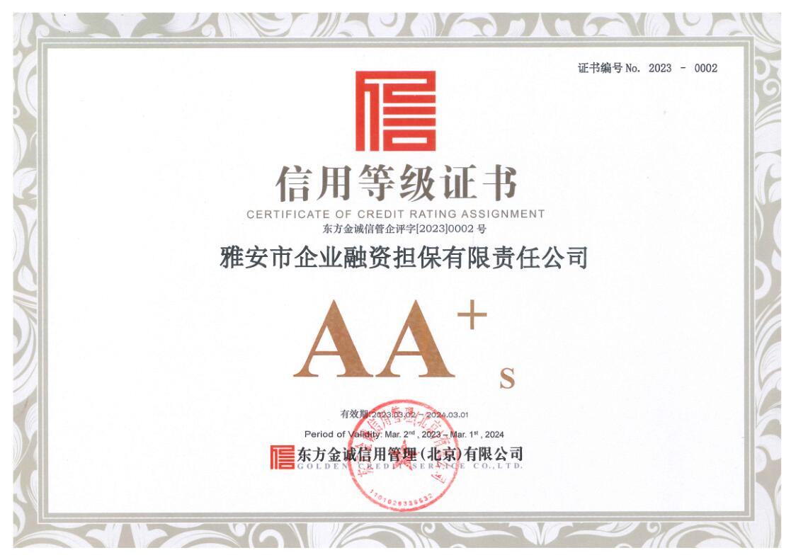 3月3日,雅安市企業(yè)融資擔保有限責任公司(以下簡稱“市擔保公司”)傳來喜訊,經(jīng)東方金誠信用管理(北京)有限公司通過對市擔保公司的信用狀況進行綜合分析和評估,確定該公司信用等級為AA+。