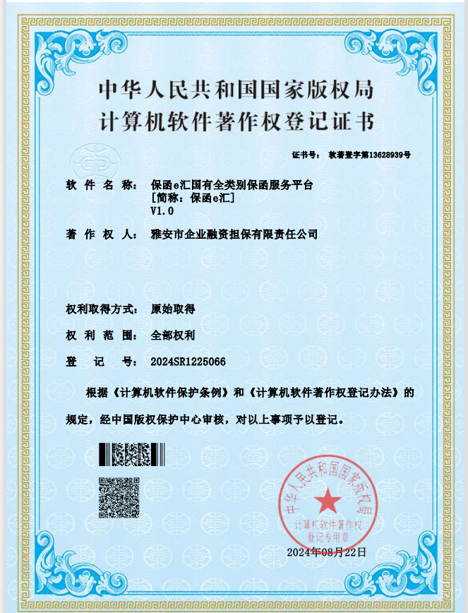 近日,由雅安市擔(dān)保公司開發(fā)完成的《保函e匯國有全類別保函服務(wù)平臺(tái)(簡稱:保函e匯)V1.0》軟件通過國家版權(quán)局的最終審查,獲得由中華人民共和國版權(quán)局頒發(fā)的計(jì)算機(jī)軟件著作權(quán)登記證書。