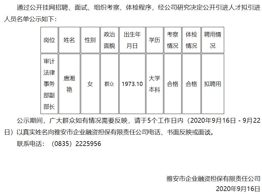 雅安市企業(yè)融資擔(dān)保有限責(zé)任公司公開(kāi)引進(jìn)人才擬引進(jìn)人員名單公示